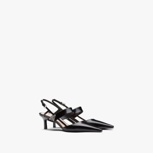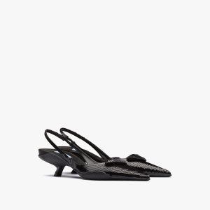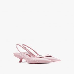 Revisiting a design from the Prada archives of the ’90s, the rubber shell sole envelops the upper of these brushed leather slingback pumps, creating a hybrid silhouette that blends a feminine pointy shape and sporty references. A distinctive element of the Spring Summer 2021 collection is the comma heel, inspired by styles from the same decade. New variations arrive for the iconic triangle, which turns into a slightly padded leather detail featuring the screen-printed Prada logo.