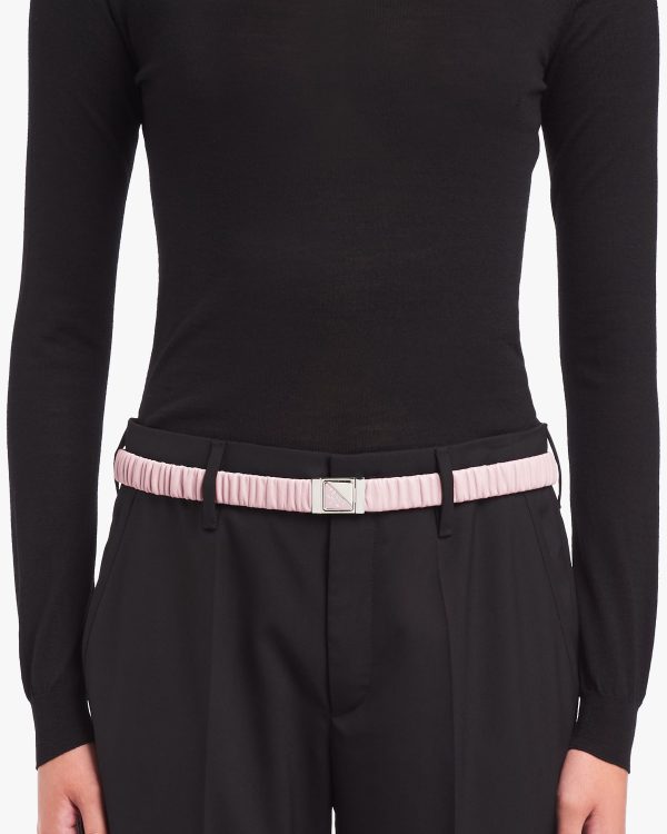 Introduced for the first time on trunks designed by Mario Prada in 1913, the historic enameled triangle logo embellishes the metal buckle of this narrow elasticized belt made of soft nappa leather.