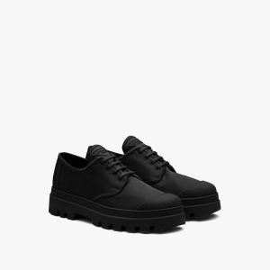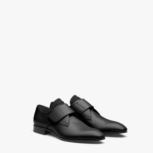 Traditionally used in high-quality, classic footwear, Prada collections have been reinterpreting brushed leather in extraordinary designs since the nineties, creating a hybrid result that reflects the dual nature of the brand. Here, the material defines a pair of Derby shoes with the Prada logo decorating the tongue.
