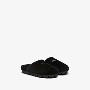 The emblematic Prada triangle is reimagined in the silkscreen logo decorating the strap of these leather slide sandals, defined by a minimal design and emphasized by a lugged rubber sole.