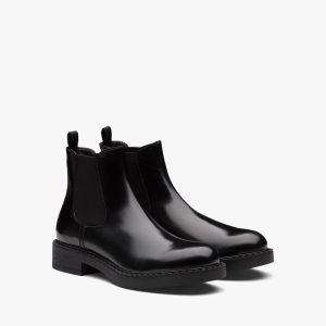 These brushed leather and nylon combat boots are decorated with a versatile pouch that recalls a multi-pocket design. The formal rigor of the uniform inspires this shoe, an expression of a timeless design, monolithic and unique, that reinterprets the dual soul of Prada from a modernist perspective. The maxi sole that defines the bold lines of Monolith footwear is combined with elegant brushed leather, emphasizing the brand’s desire to create harmony through diametrically opposed hybrid concepts.