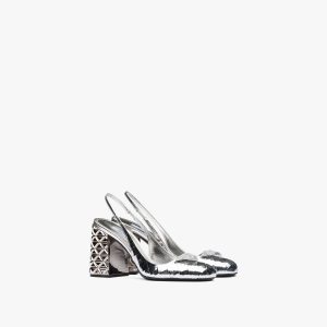 New variations arrive for the iconic triangle, which turns into a handmade rose that is a contemporary take on refined shoe ornaments of the fifties. Revisiting a design from the Prada archives of the ’90s, the rubber shell sole envelops the upper of these nylon gabardine slingback pumps, creating a hybrid silhouette that blends a feminine pointy shape and sporty references. A distinctive element of the Spring Summer 2021 collection is the comma heel, inspired by styles from the same decade.