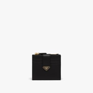 This practical Saffiano credit card holder with six slots and a center pocket is decorated with the lettering logo.