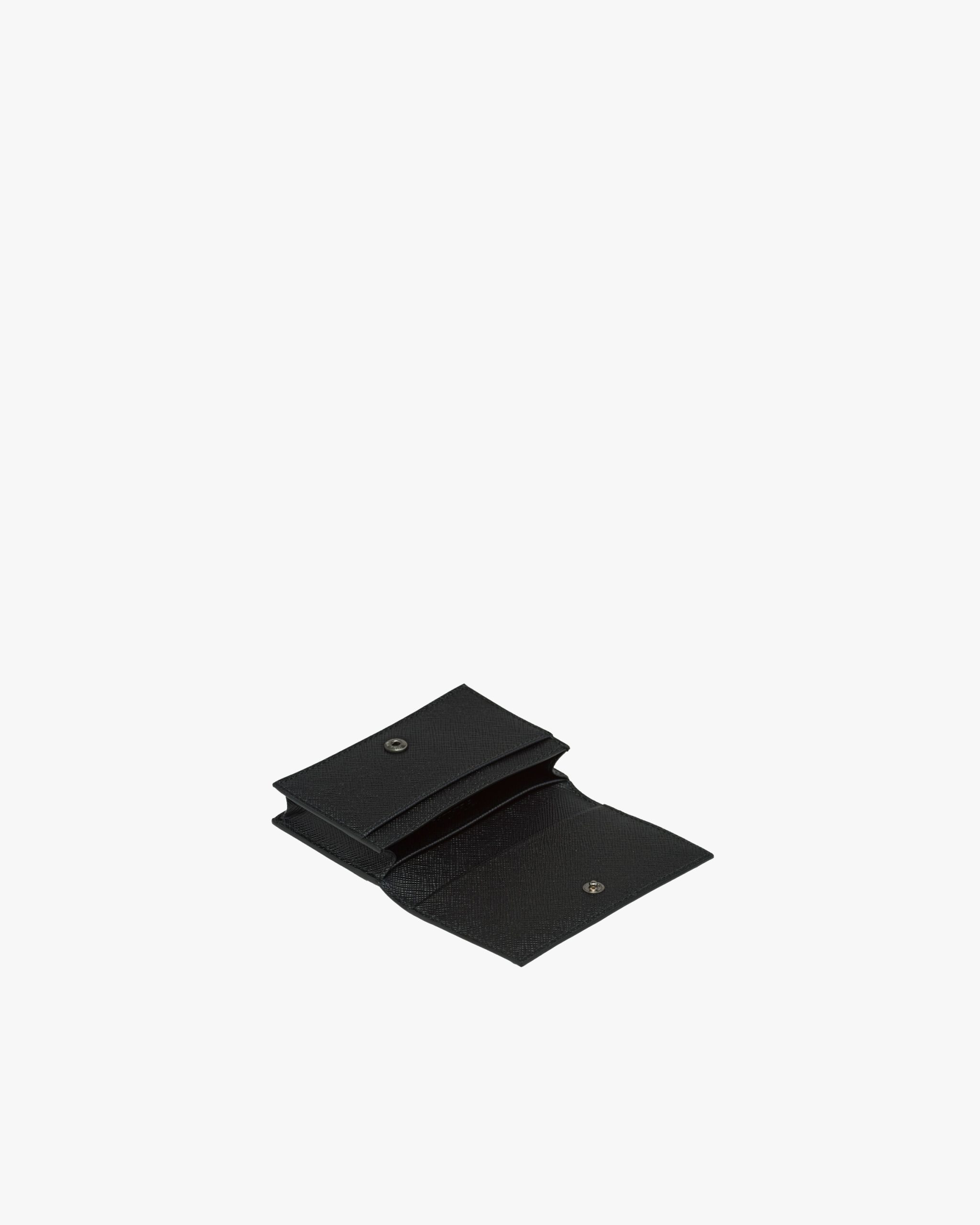 This Saffiano leather credit card holder is detailed with a Prada logo in the bottom corner. One main compartment with bellow and three compartments are revealed by the snap closure.