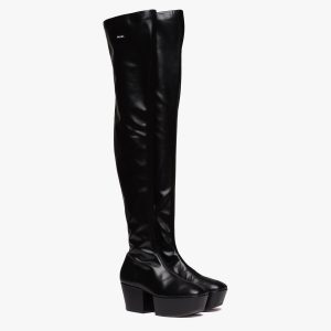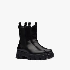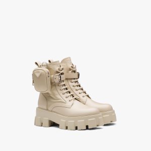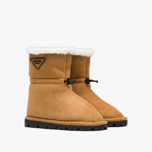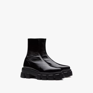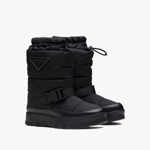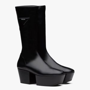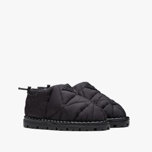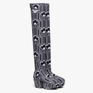 Inspired by architectural geometric shapes from the seventies, these platform boots are made of knit fabric and characterized by the fine jacquard motif. Jacquard motifs coordinated with accessories and ready-to-wear garments recreate the idea of total looks with elaborate patterns formed through layering, continuity, and contrasts. Infused with a modernist soul, the design reinterprets retro lines in a new way. The screen-printed triangle logo gives the product an iconic accent.