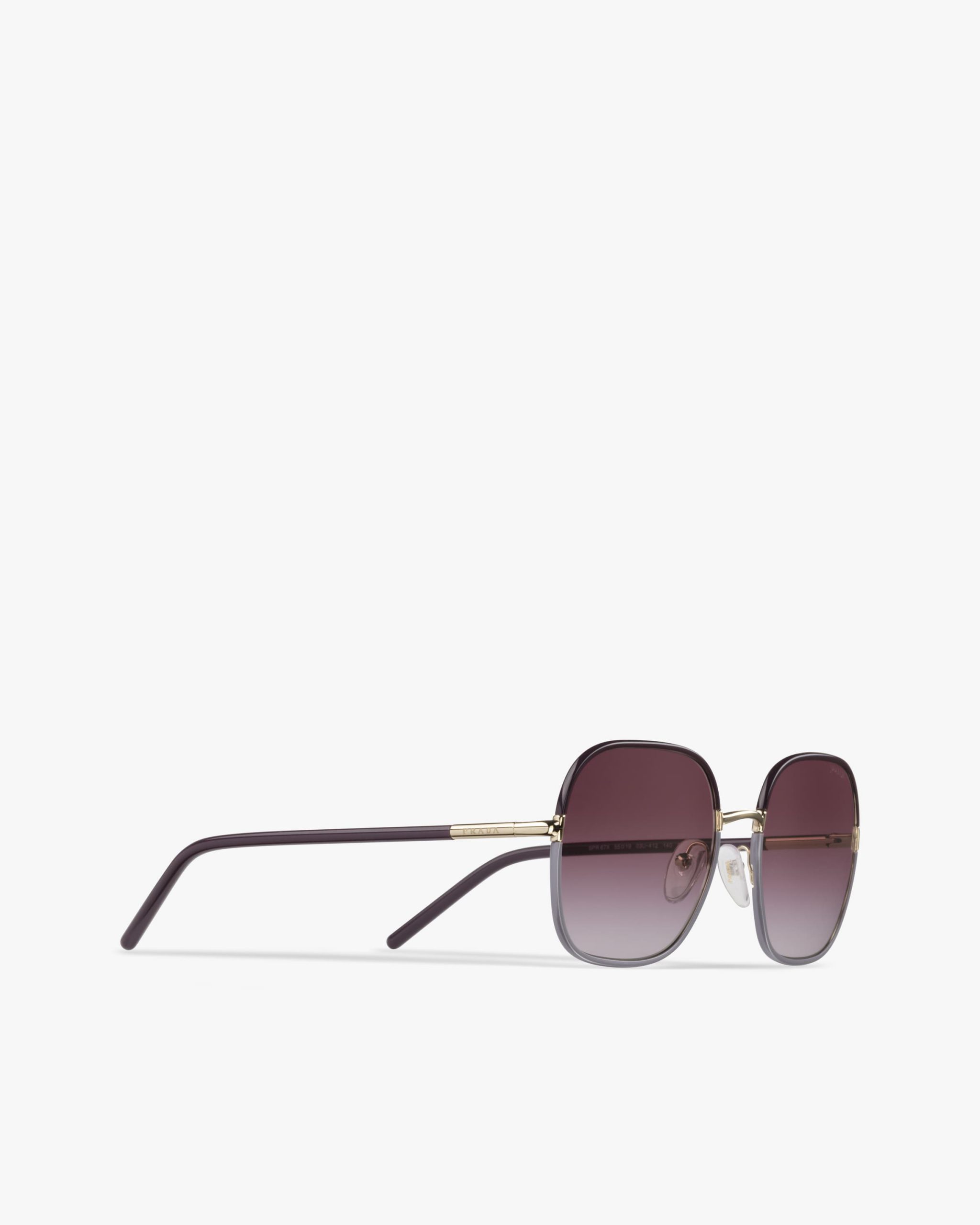Sunglasses with contemporary, feminine allure. The square design with refined trim is characterized by metal inserts that interrupt the continuity of the silhouette and emphasize the color combinations. Prada lettering logo.