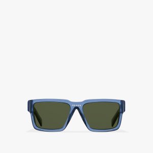 Sunglasses with contemporary, feminine allure. The square design with refined trim is characterized by metal inserts that interrupt the continuity of the silhouette and emphasize the color combinations. Prada lettering logo.