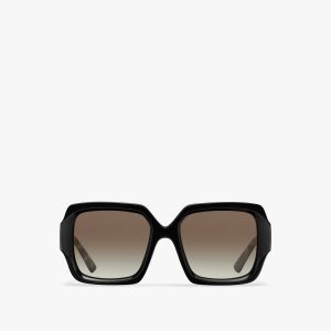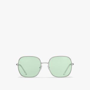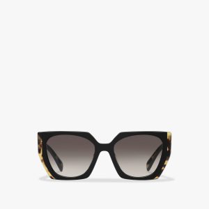 Sunglasses with contemporary, feminine allure. The square design with refined trim is characterized by metal inserts that interrupt the continuity of the silhouette and emphasize the color combinations. Prada lettering logo.