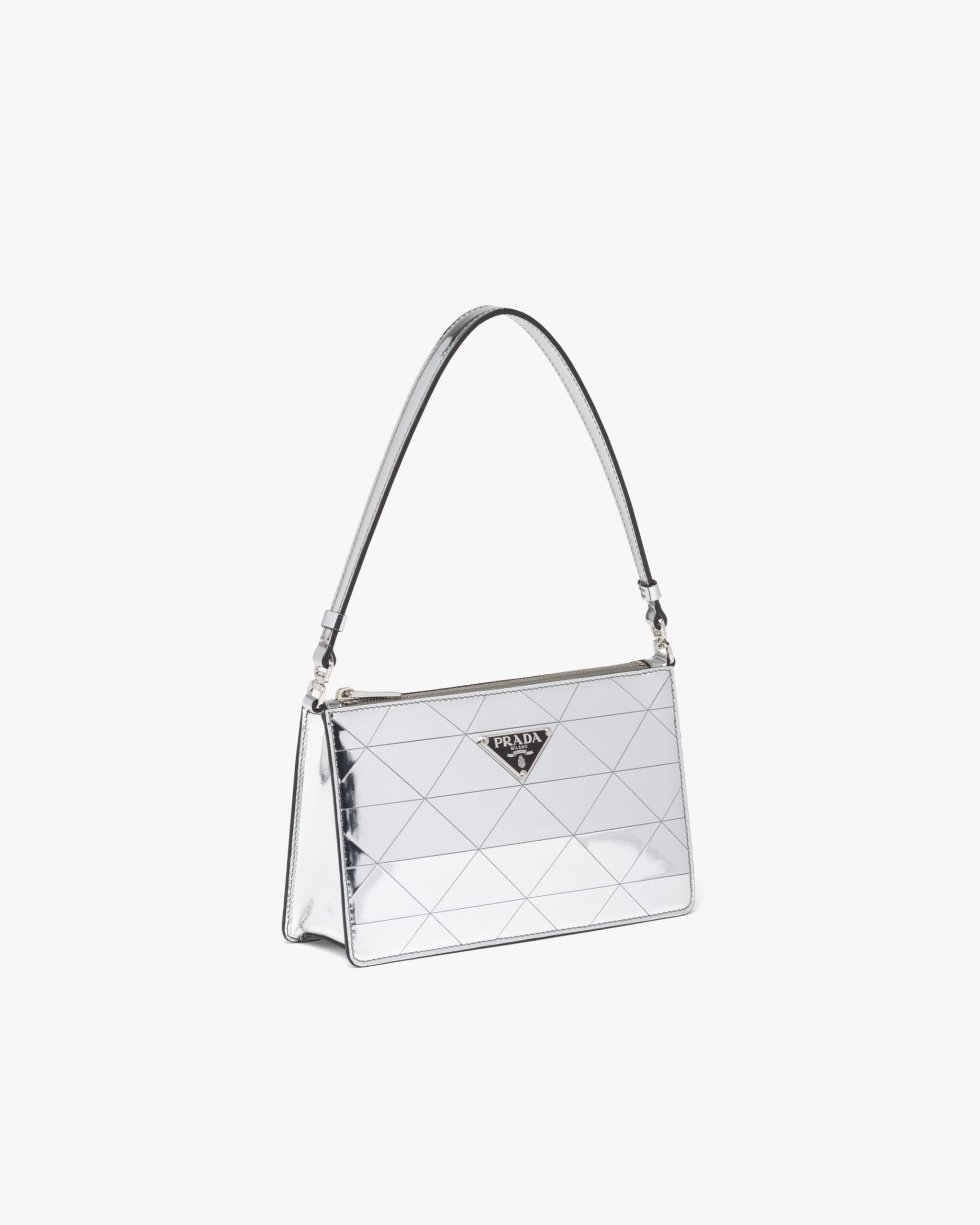 This mini-bag decorated with the enameled triangle logo and defined by its structured design comes in metallic leather featuring fine workmanship. A study of the triangle inspires new geometric shapes and unique interpretations of Prada’s historic code. The iconic shape is echoed in the motif that decorates the surface for a faceted and luminous effect.