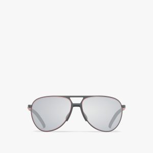 Sunglasses with the classic pilot silhouette, reinterpreted in a sporty way. The metal frames are characterized by lenses with enameled outer rims in metallic and matte shades. They have an ergonomic rubberized nose pad that ensures a comfortable fit. The construction of the temples is sharply interrupted, creating a dynamic, sporty effect. Prada Linea Rossa logo.