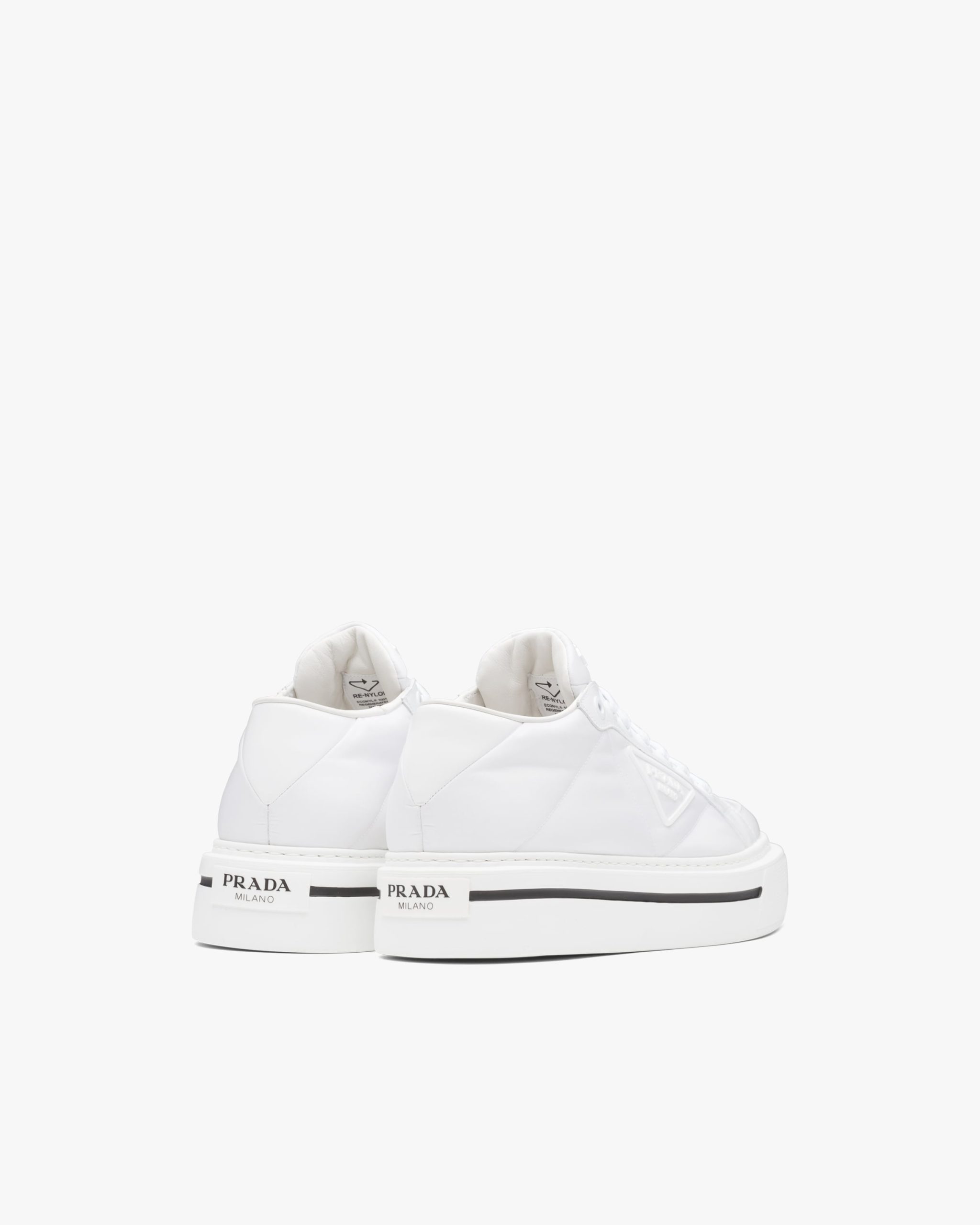 Defined by a design with a lightweight sole and rubber triangle logo, these high-top sneakers are characterized by a mix of iconic Prada materials: brushed leather and Re-Nylon, made from recycled and purified plastic trash collected in oceans, fishing nets and textile waste fibers.