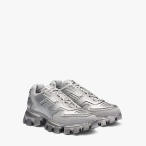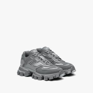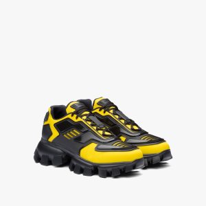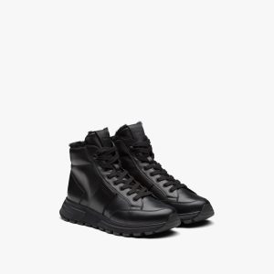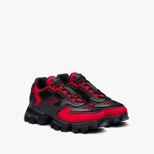 Defined by a contemporary attitude, Prada’s new high-top sneakers are inspired by the design of sport shoes of the 1970s. Made of Re-Nylon Gabardine fabric, they are accented by details on the sole reminiscent of motocross tire treads. A removable pouch is applied on the shoe.